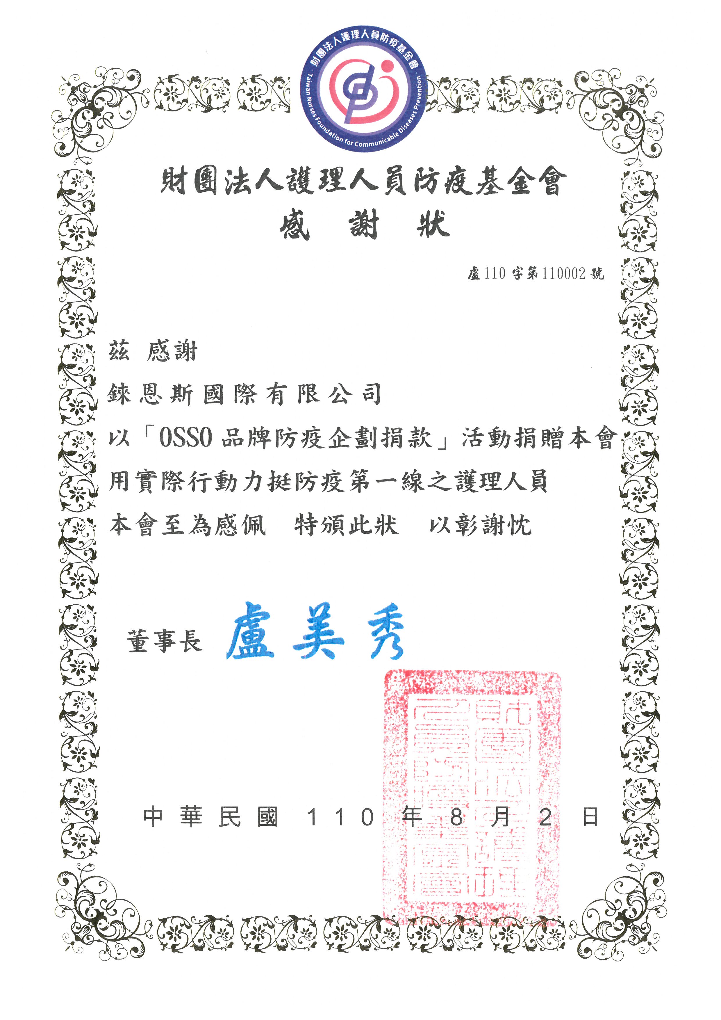 以「OSSO品牌防疫企劃捐款」活動捐贈本會